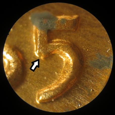 Master die doubling on 1965 Lincoln cents. The notching on the corner of the 5 is found on all cents from 1965. This example is from a 1965 Special Mint Set (sms).