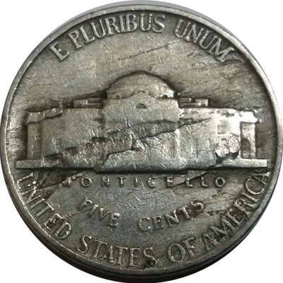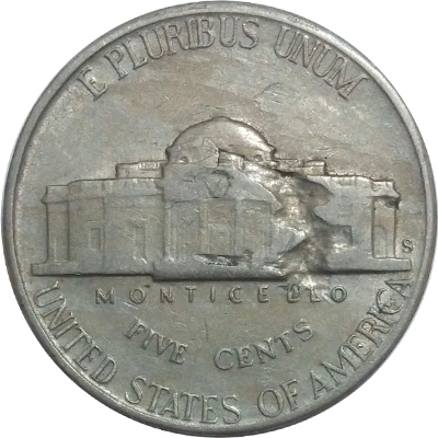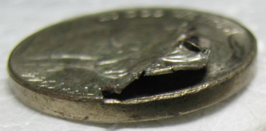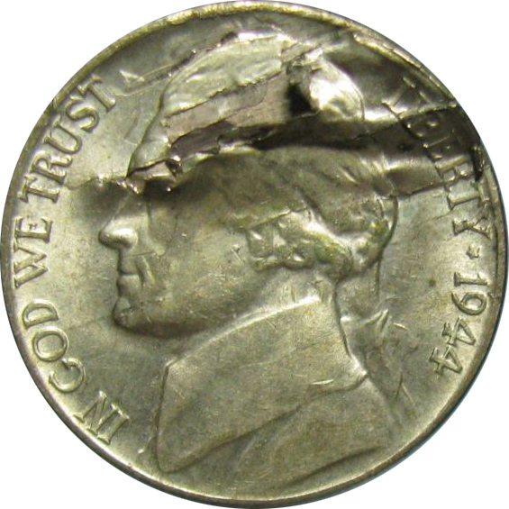 Lamination errors are defects in the planchets that can cause splitting and peeling away of a layer of the metal. Sometimes the peeled away part can separate before the coin is struck. It can also be folded over.