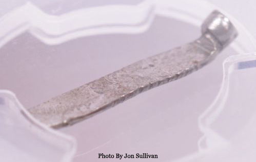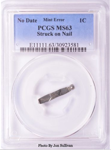 No date Lincoln memorial cent struck on a steel nail. One of only a few known. It is extremely rare for a coin to be struck on a foreign object, but it can and does happen