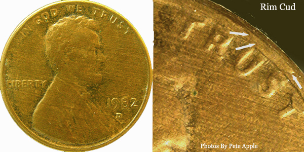 A cud is a raised area on the rim of a coins surface caused by a die break where a piece of the die is missing. A retained cud is caused from the same type of die break, but instead of falling out, the broken piece of die remains intact, causing a raised line to appear on the coins surface.