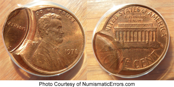 Peeling of any part of the surface of a planchet causes what is know as a lamination error. The laminated part of the coin may be very small or run completely across the surface of the coin. Sometimes, the laminated layer will fall away and be completely missing, other times it can be folded back across the surface of the coin.