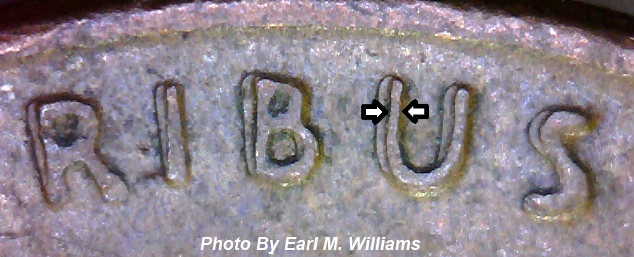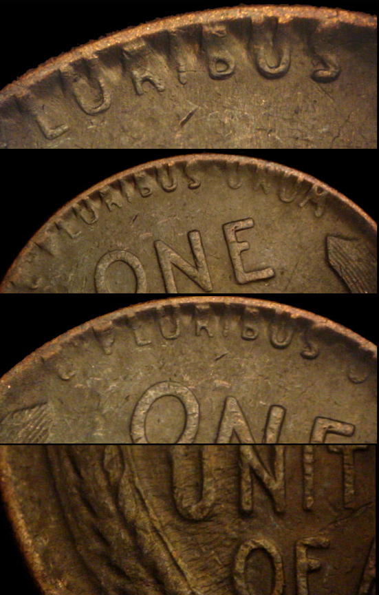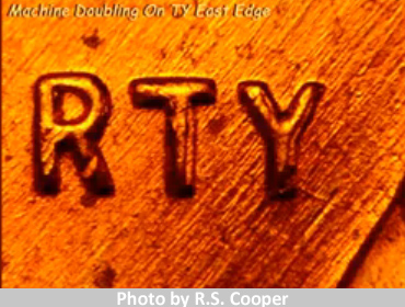 On the reverse side of this 1953-D shown above, notice how the original devices are narrowed by the mechanical doubling. The secondary image is flat. not raised and rounded like the original.
