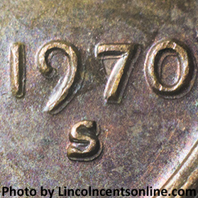 This 1970-S is a good example of the machine doubling. Notice how the date is clearly doubled but so is the mint mark? Also take notice of the flat, shelf like appearance of the secondary image.