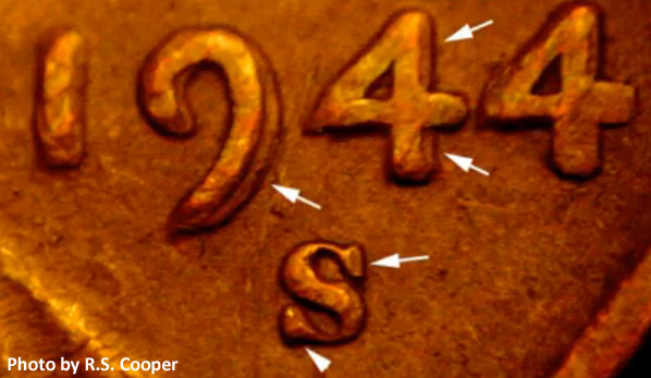 Split plate doubling usually occurs on the side of the devices facing the rim. It is most commonly found on the mint mark but it can affect any of the raised areas of the coins design.