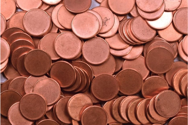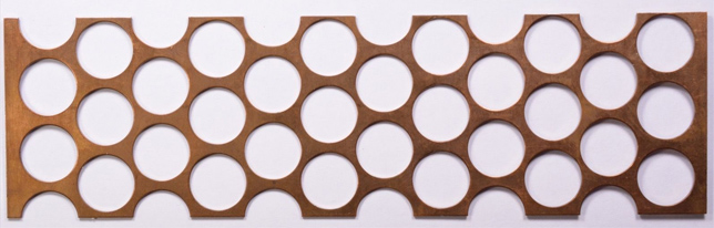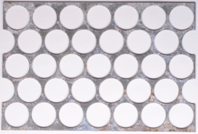 A sheet of metal stock after it has had the cent size blanks punched out of it.