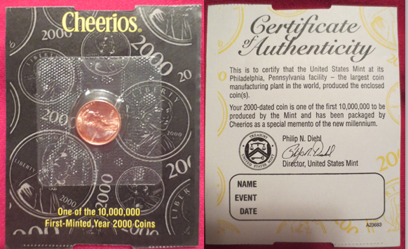 In early 2000, 10,000,000 newly struck cents were sealed with plastic on cardboard cards and placed into boxes of Cheerios cereal as a way of promoting the new millennium and the new Sacagawea dollars (5500 of the cards had the new gold colored dollars on them along with the cent). The Sacagawea dollars that were placed in the boxes are highly valued by collectors as they were made with different dies than the coins minted later for circulation. This was not known at the time of the promotion.