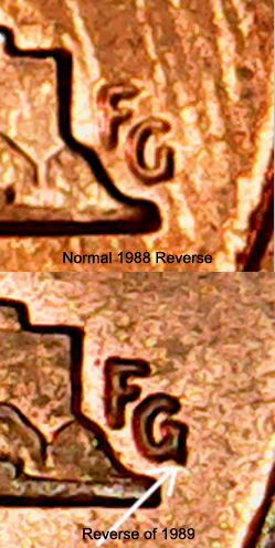 The wrong die can be left over from a previous year or one that was not intended to be used until the following year. One example of this is the 1988 and 1988-D cents. These coins have the reverse design that was intended to be used on the 1989 cents, but was put into use early by mistake. A similar thing happened in 1989 with the cents having the reverse design that was intended to be used on the 1988 cents. This also happened at both mints.